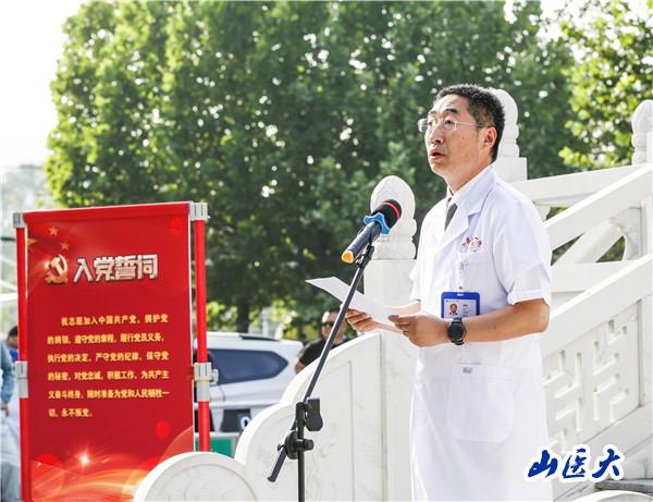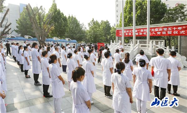 7月1日,在中国共产党成立101周年之际,第一医院在1号住院楼前广场举行“光荣在党50年”纪念章颁发暨新党员入党宣誓仪式。全体院党委委员,各党支部书记、副书记,获得“光荣在党50年”纪念章的老党员代表和2022年新入党的职工党员共计100余人参加了仪式。院党委副书记、院长张瑞平主持仪式。