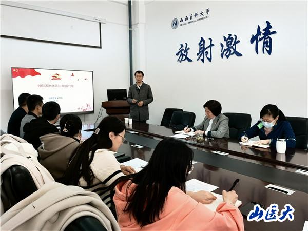 为深入学习贯彻习近平新时代中国特色社会主义思想和党的二十大精神,把教工党员的思想统一到党的二十大精神上来,理论联系实际,凝心聚力于学校和学院的各项重点工作。医学影像学院教工党支部于3月14日在中都校区至善B一层108会议室开展了学习贯彻党的二十大精神主题党日活动。此次活动由学院党总支书记孙天青主持,思政课骨干教师宣讲团成员、马克思主义学院薛冬受邀主讲,教工支部全体13名党员参加了学习。