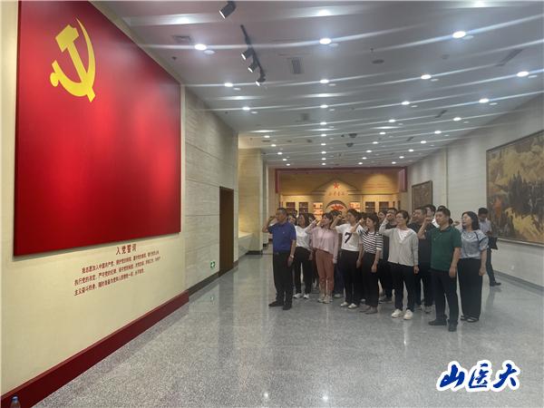 在八路军太行纪念馆参观结束时,带着对革命先辈的无限敬仰之情,全体党员干部面向党旗整齐列队,庄严举起右手,重温入党誓词,表达对党的无限忠诚和甘于奋斗奉献的坚定决心。